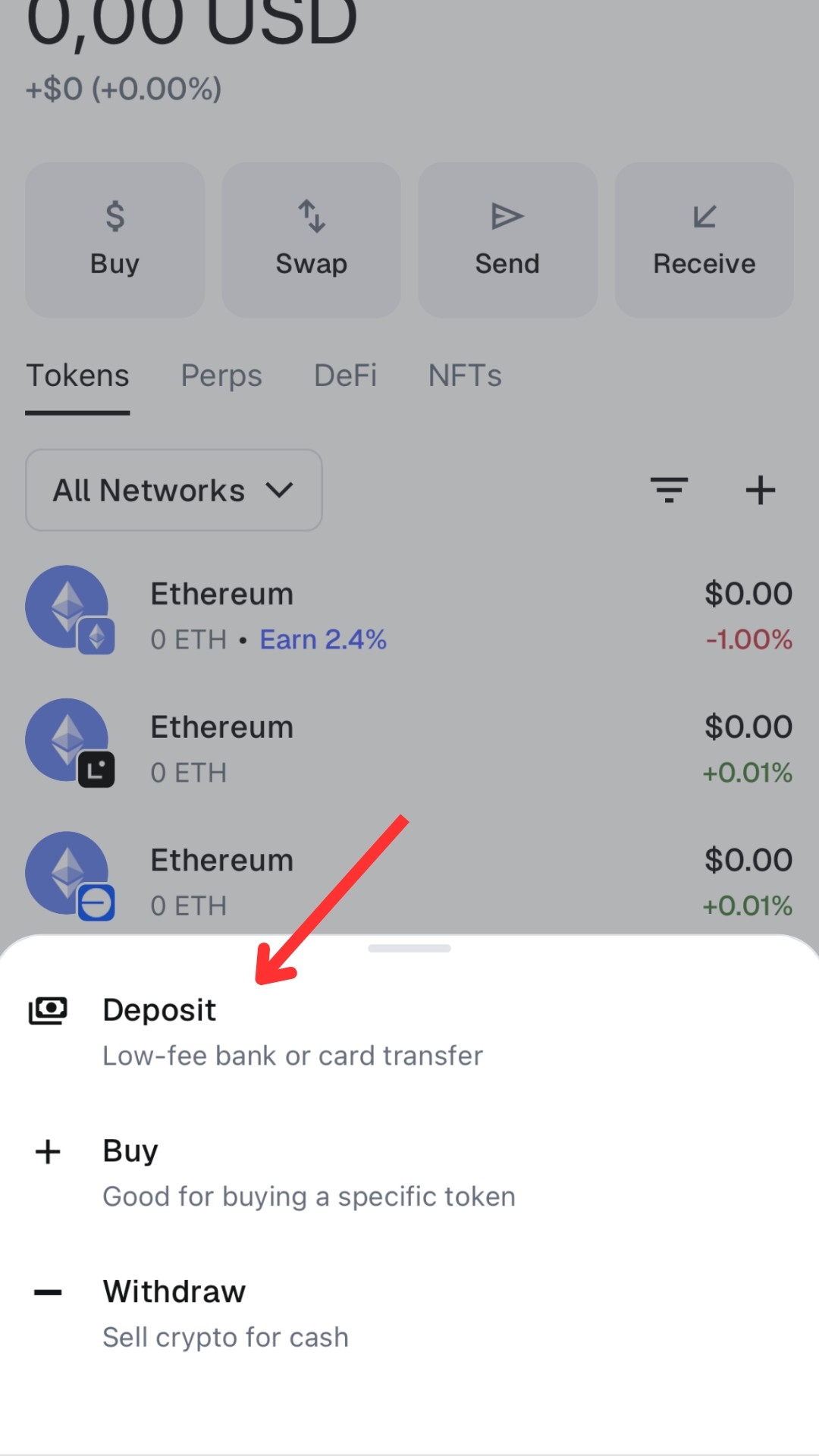 Nel menù che si apre ci saranno 3 tasti: Deposit - Buy - Withdraw. Premi il tasto "Deposit"