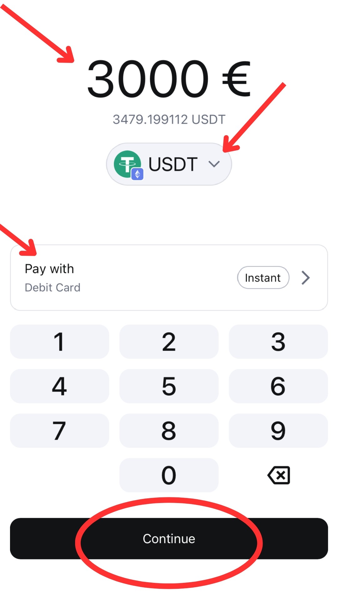 Subito sotto l'importo andremo a selezionare ciò che andiamo ad acquistare, in questo caso USDT (Presta attenzione al fatto che sotto USDT ci deve essere scritto Ethereum in piccolo