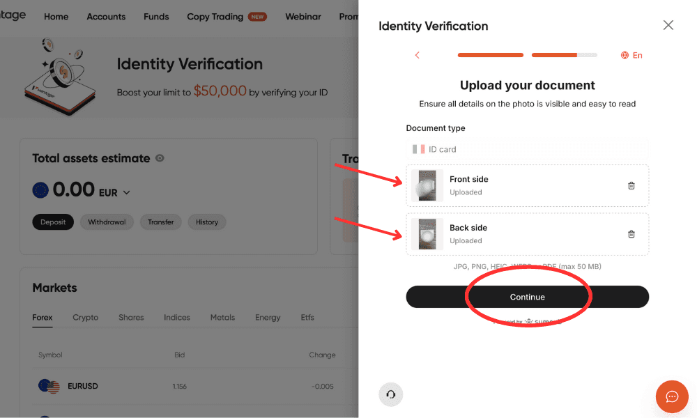 Caricare nelle rispettive sezioni fronte e retro del documento selezionato (Importante: il documento deve essere scattato con la telecamera del dispositivo, se stai effettuando la registrazione via pc scatta una foto con il cellulare > Inviala al tuo pc > Allegala) (Il sistema boccerà automaticamente: Scan, PDF, Foto non leggibili, Documenti non riportanti i dati forniti in precedenza)