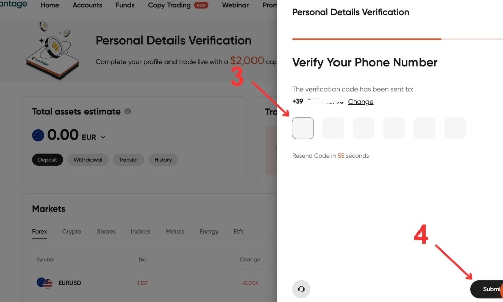 Compila con il codice che ti è appena arrivato via SMS
