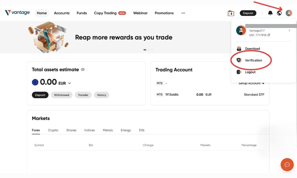 Accedi al tuo account Vantage e rimani sulla Home Page dopo il login.