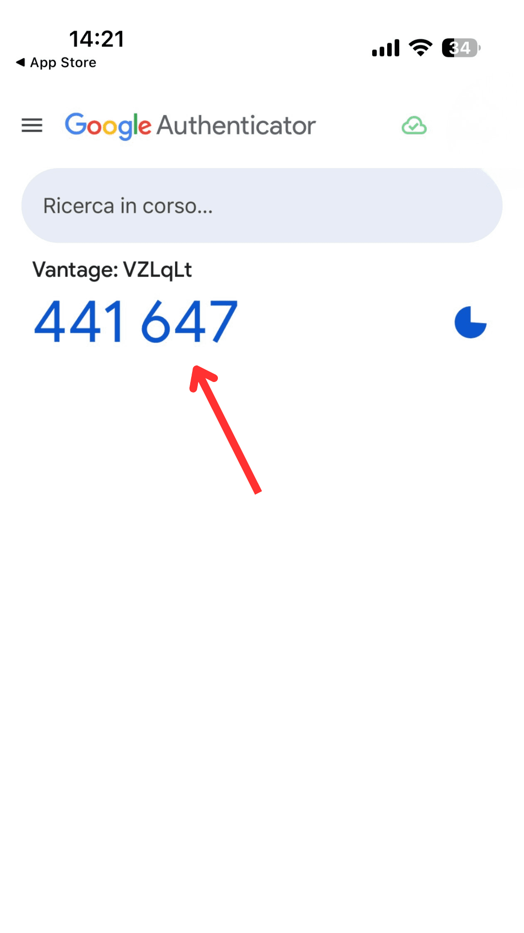 Se la scansione è andata a buon fine, in Google Authenticator compare una nuova voce chiamata “Vantage” con sotto un codice di 6 cifre e un piccolo contatore circolare che si svuota: indica i 30 secondi di validità del codice.