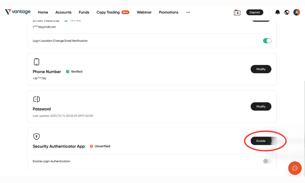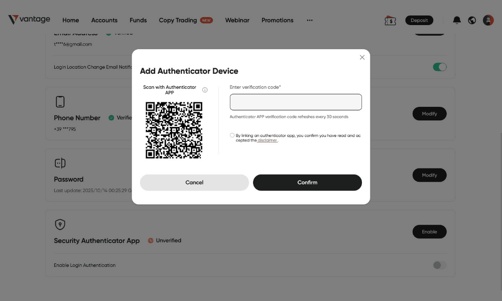 Quest’app si chiama Google Authenticator. È gratuita, si scarica in pochi istanti e genera codici numerici di sei cifre che si aggiornano continuamente. Ogni volta che effettuerai l’accesso al tuo conto Vantage, dovrai semplicemente aprire l’app, leggere il codice che appare accanto alla voce “Vantage” e inserirlo sul sito. È un modo semplice ma molto efficace per assicurarti che solo tu possa accedere al tuo profilo, anche se qualcuno dovesse scoprire la tua password.